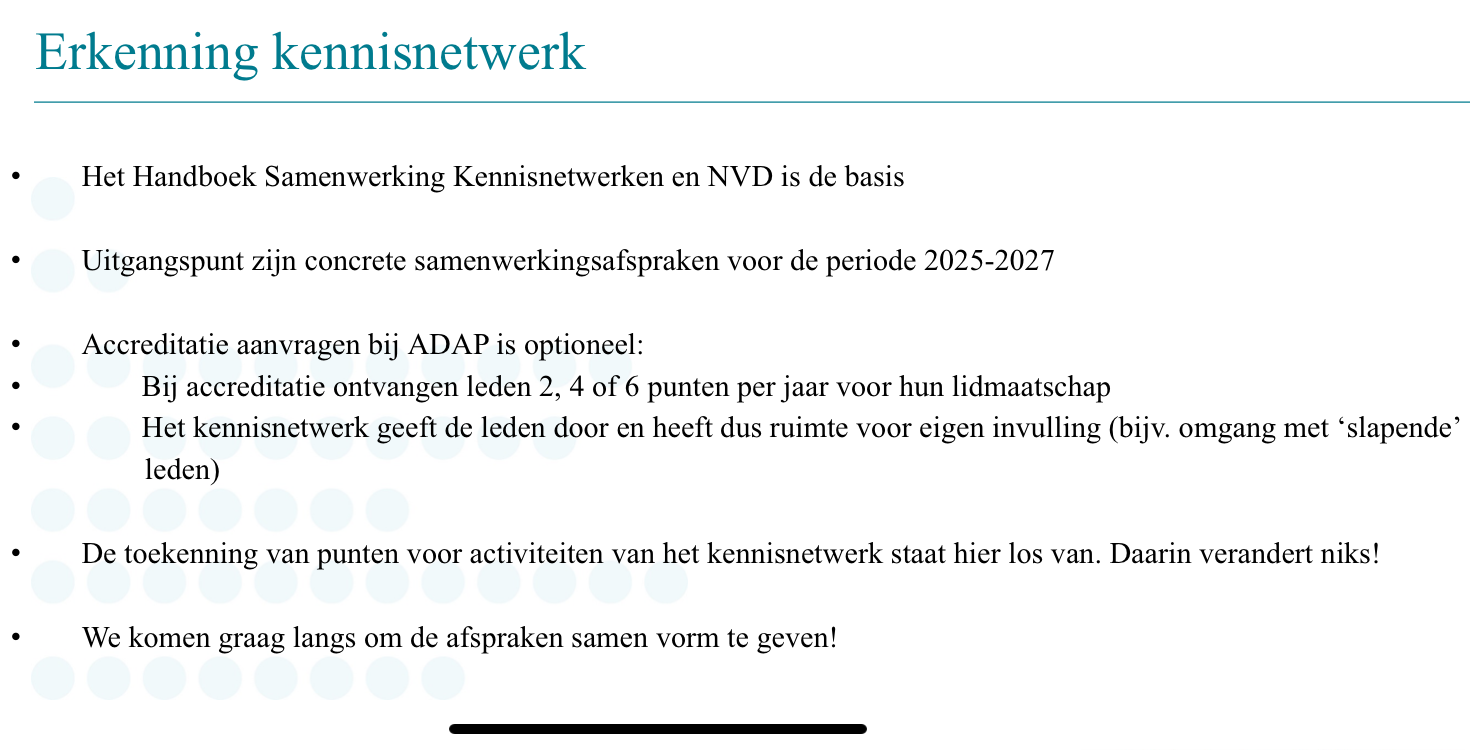 De NDE is een door de NVD erkend netwerk. Daarnaast kunnen we door Stichting ADAP erkend worden. Lidmaatschap van een door St. ADAP erkend netwerk biedt KP-punten. Leden kunnen met enkel lidmaatschap KP-punten ontvangen. Dit staat los van de reguliere punten die toegekend worden bij activiteiten die voor of vanuit het netwerk worden verricht. De NDE buigt zich nog over hoe lidmaatschap vormgegeven dient te worden om hiervoor in aanmerking te komen. Actief lidmaatschap, zoals bijwonen van jaarlijkse themabijeenkomsten, is hiervoor een criterium dat wij in overweging nemen. Wij zijn hierover eveneens in gesprek met de andere netwerken en de NVD.