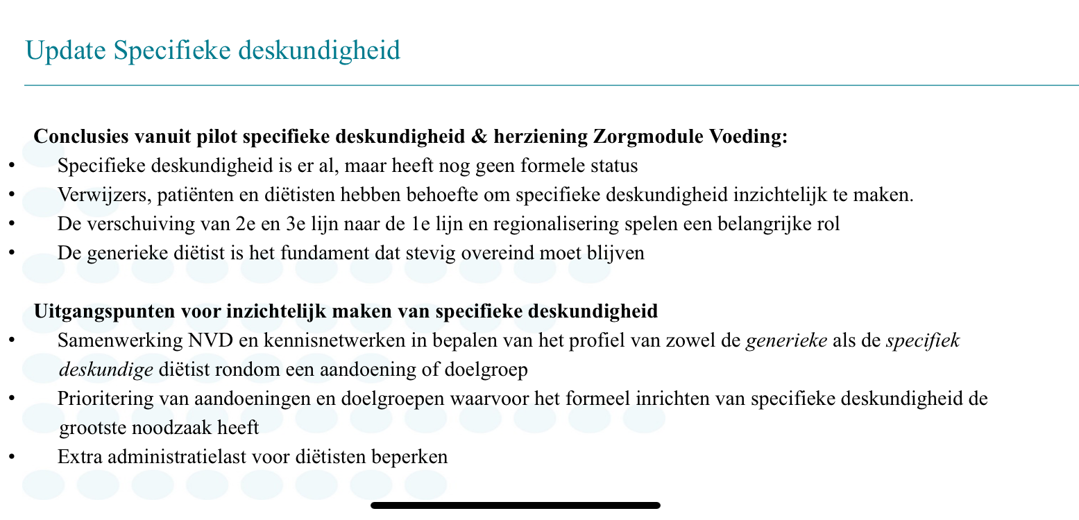 Vanuit de NVD werd nader toegelicht wat de achterliggende gedachte is geweest van het specificeren van deskundigheid van diëtisten. De behoefte aan een apart ‘label’ is ooit voortgekomen vanuit zowel patienten, als artsen en diëtisten zelf. Aandoeningen en diagnoses als DM I met comorbiditeit bleken vragen op te roepen onder meer vanuit de Nederlandse Diabetes Federatie met de wens om goede zorg. Artsen lijken zoekend naar wie gespecialiseerd is in specifieke aandoeningen als eetstoornissen en collega-diëtisten vragen zich af naar welke collega door te verwijzen die meer afweet van orthomoleculaire voedingszorg. Begrijpelijkerwijs levert dit vragen op bij diëtisten die niet het label Specifieke deskundigheid hebben. Onderstaande geeft een update van de conclusies uit de pilot die heeft plaatsgevonden. Wij houden in de gaten welke ontwikkelingen er zijn en zullen onze leden zo goed als mogelijk op de hoogte houden van de ontwikkelingen.